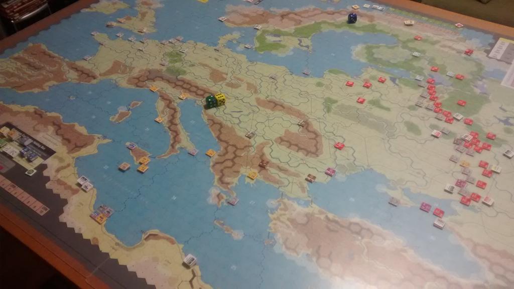 El progresivo deterioro de la capacidad industrial del Eje y la potencia creciente del bando aliado (el norteamericano tiene tooooda la producción que necesite) se van manifestando, así, a medida que la partida discurre. Con el tiempo el alemán no podrá ni siquiera activar muchas de sus tropas, algo menos grave pues estará a la defensiva, pero tampoco recuperarse de sus graves pérdidas.