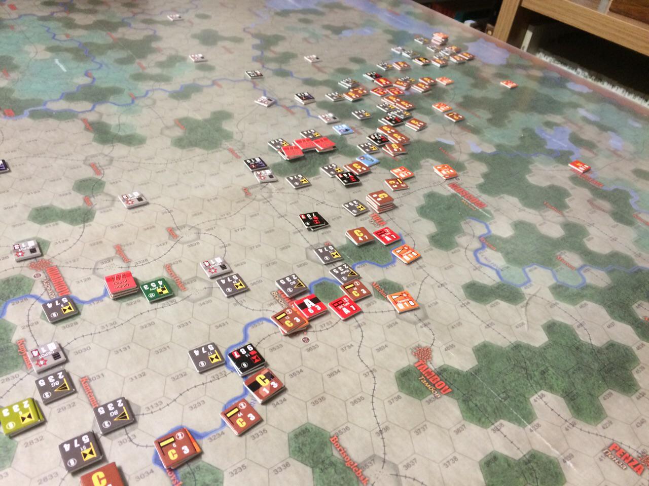 Se pueden ver, además de los marcadores citados, otros como los de "out of supply" (rojos) o de recursos (naranjas), ya sean fábricas, pozos petrolíferos... que sirven para representar de forma simplificada, que no simplista, el esfuerzo de guerra soviético: Así, en función de los que le capturen y/o no pueda evacuar pierde capacidad de producir lo que denominaríamos "elementos de apoyo estratégicos", ejemplificados en líderes que dan un bonus a los ataques pero que más bien representan la acumulación de repuestos, reservas o unidades independientes de lanzacohetes (una especie de marcador de "ataque determinado" como en el SPII pero a mayor escala).